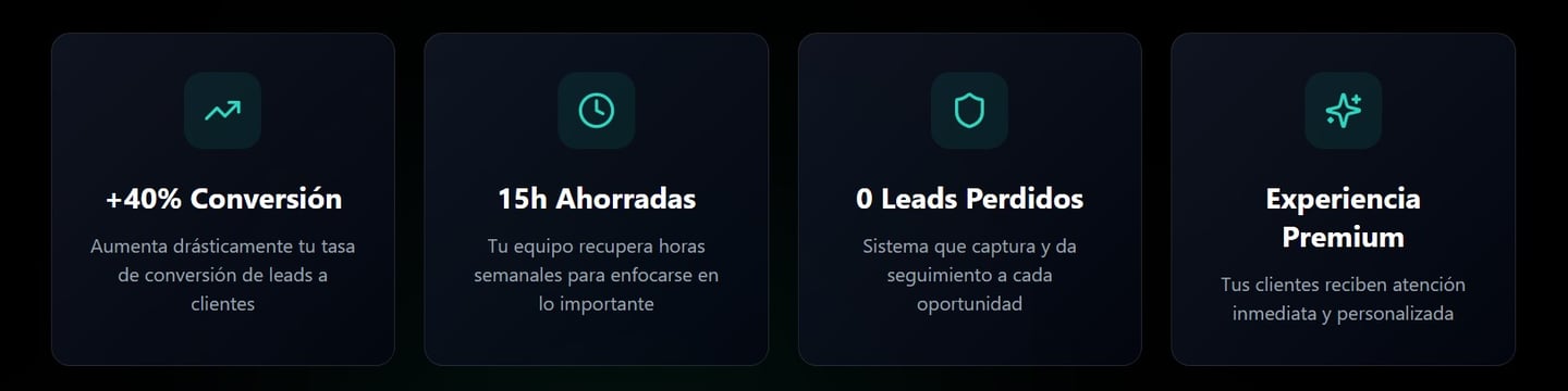 Nuestros clientes ven en promedio un aumento del 40% en conversión de leads y recuperan la inversión en los primeros 2-3 meses. El ahorro en tiempo del equipo y la captación de leads fuera de horario multiplican el valor.