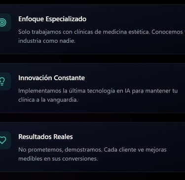 Somos una agencia especializada en crear sistemas de automatización e inteligencia artificial diseñados específicamente para clínicas de medicina estética. Entendemos tus desafíos únicos porque solo trabajamos con negocios como el tuyo.