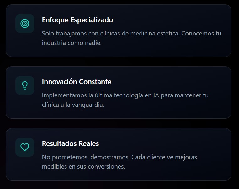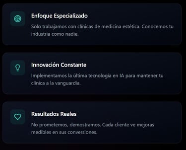 Somos una agencia especializada en crear sistemas de automatización e inteligencia artificial diseñados específicamente para clínicas de medicina estética. Entendemos tus desafíos únicos porque solo trabajamos con negocios como el tuyo.